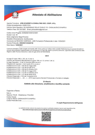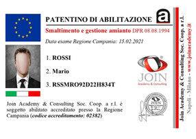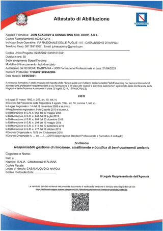 Abilitazione ai fini dello svolgimento dell'attività di ADDETTO ALLE ATTIVITÀ DI RIMOZIONE, SMALTIMENTO E BONIFICA AMIANTO ai sensi dell' art.10, comma 7 del DPR 08.08.1994.
