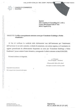 Verifica conseguimento attestato corso (PEC della Camera di Commercio di Salerno - 03.11.2020)